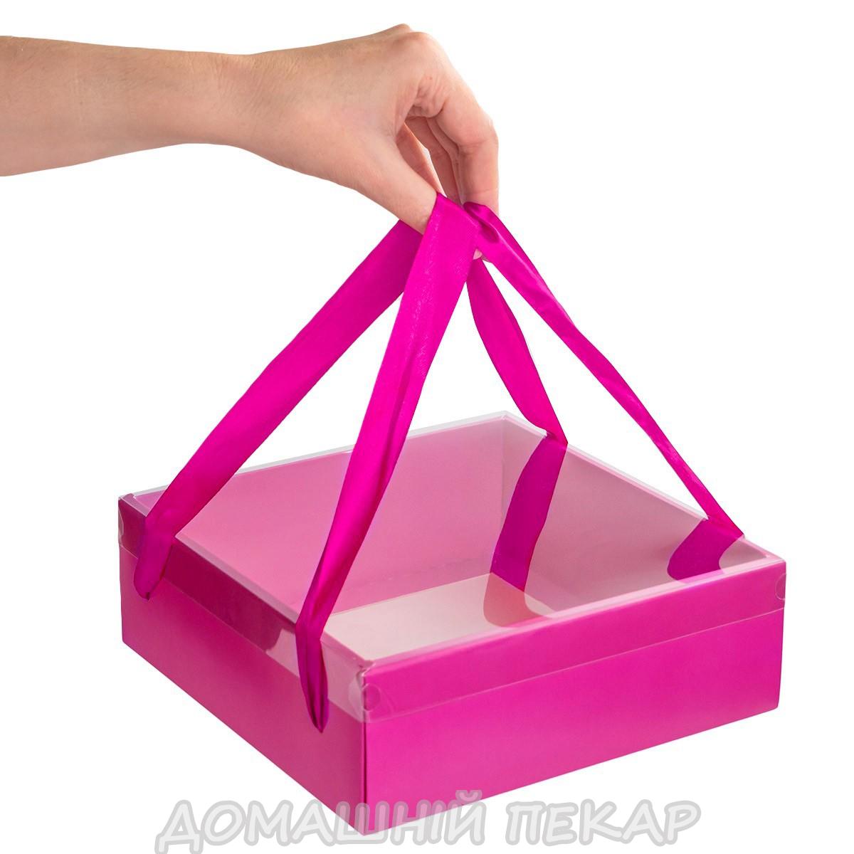 Коробка з ручками зі стрічки 21*21*7 см Фуксія