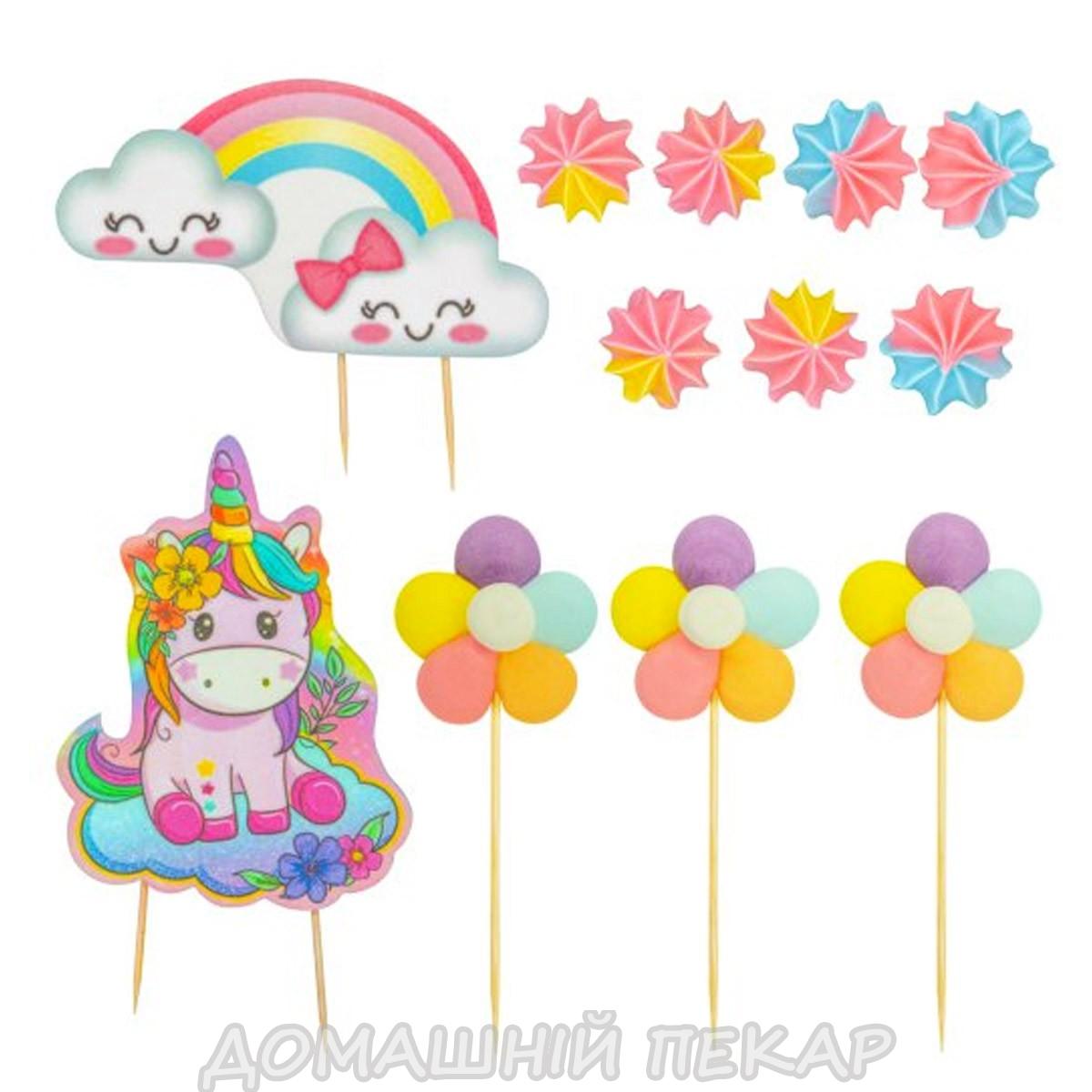 - В наборі: топери на шпажках - 5 шт (3 квіточки, 1 одноріжка, 1 хмаринка) безе - 7 шт.