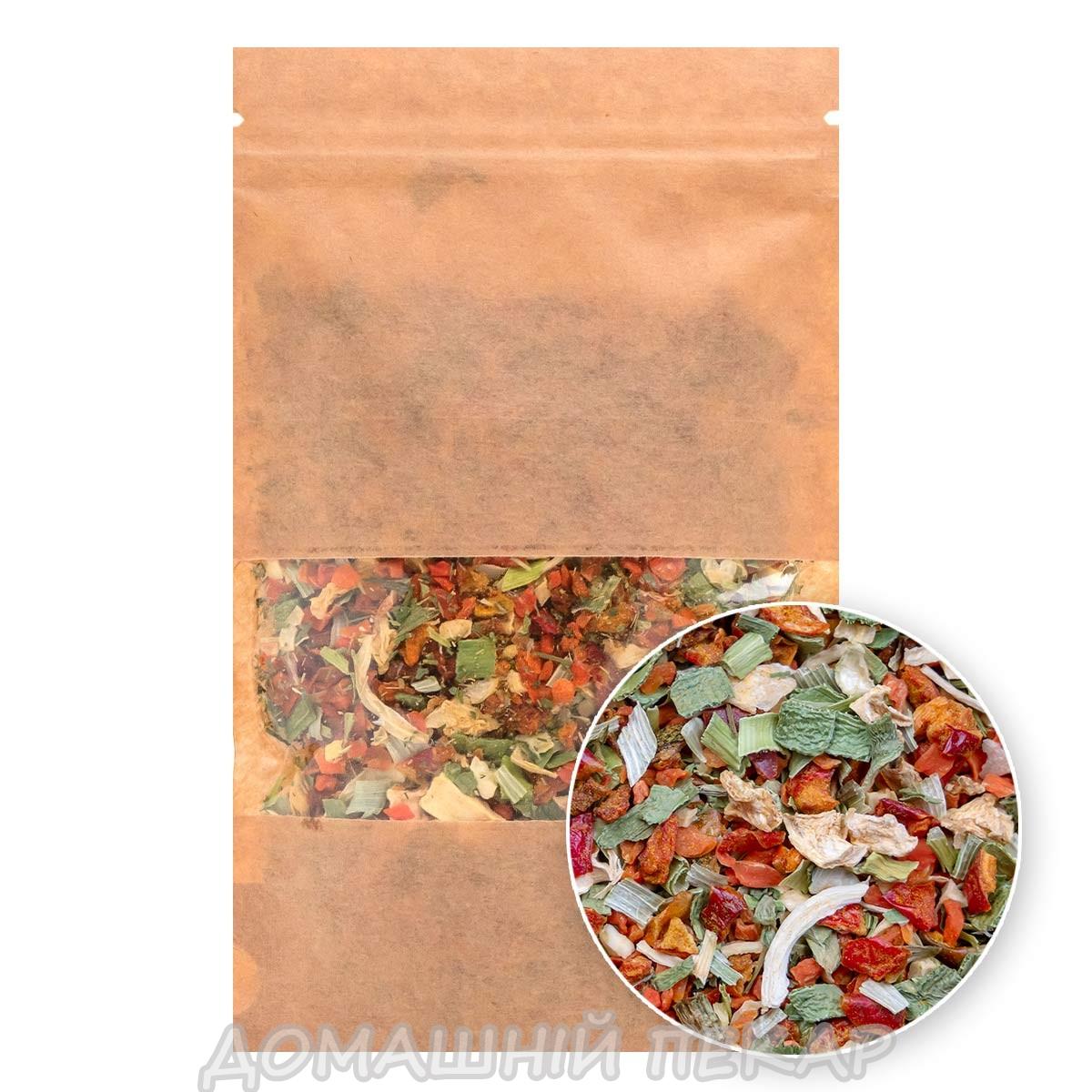 Склад: морква сушена подрібнена, паприка червона подрібнена, коріння пастернаку сушене подрібнене, коріння селери сушене подрібнене, цибуля порей сушена подрібнена, цибуля ріпчаста сушена подрібнена, цибуля зелена сушена подрібнена, петрушка сушена, кріп сушений, куркума мелена.