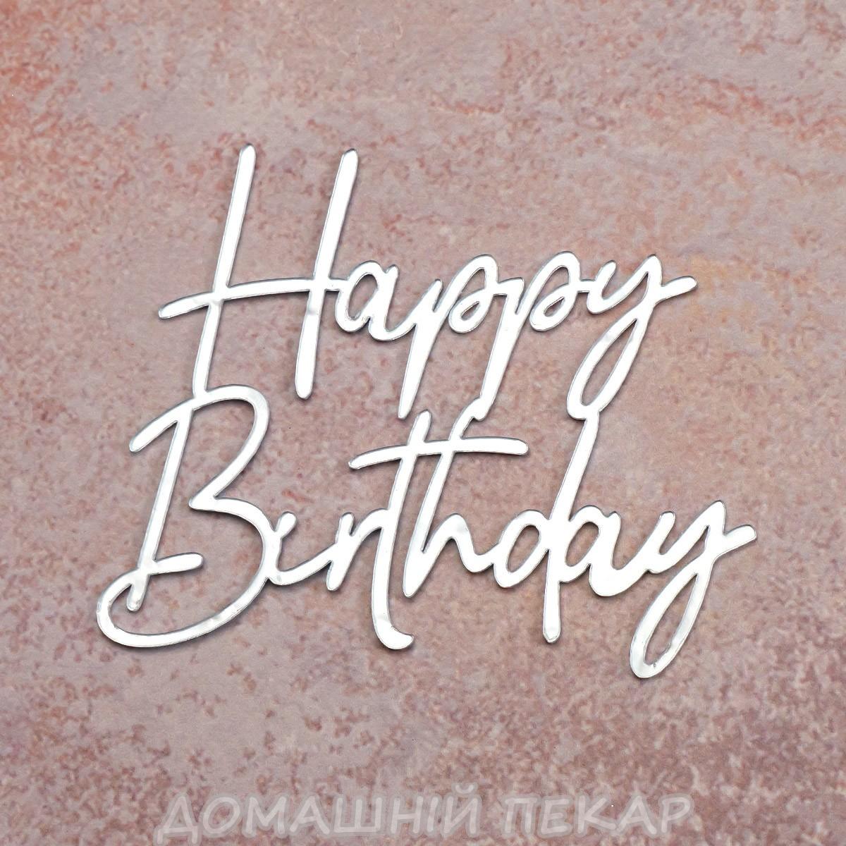 Топпер дзеркальний для торта бічний Happy Birthday срібний