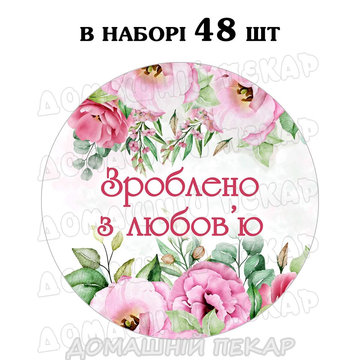 Наклейка Зроблено з любов'ю рожеві квіти 3 см, аркуш 48 шт (N)